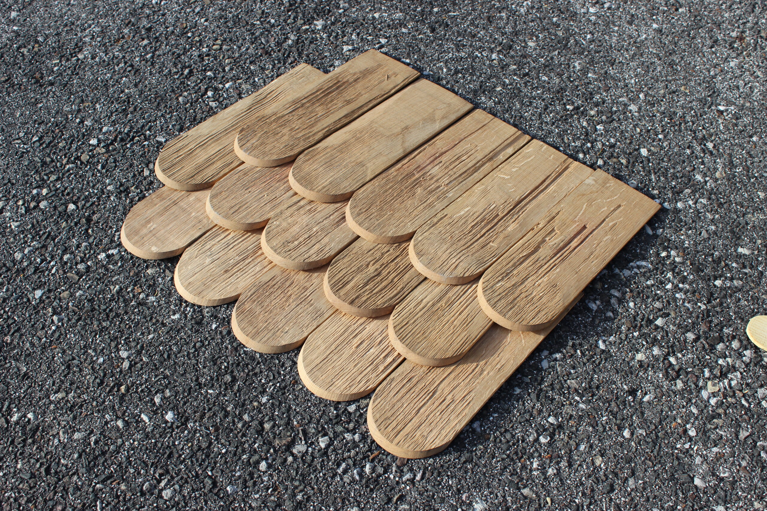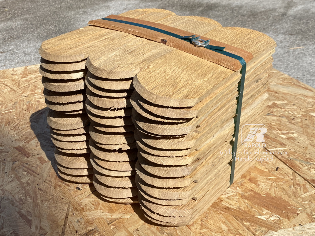 Eichen-Rundschindeln, gespalten und maschinell keilig geputzt