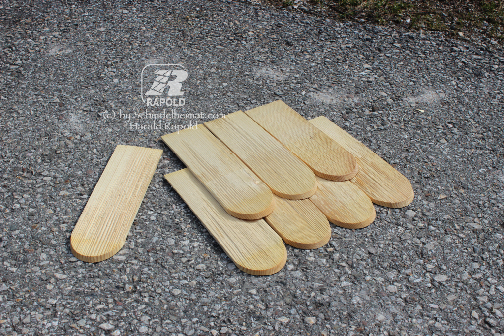 Die zweite Lage wird mit den 30 cm langen Schindeln gedeckt, so dass am Fußpunkt zwei Lagen Schindeln aufeinander liegen.